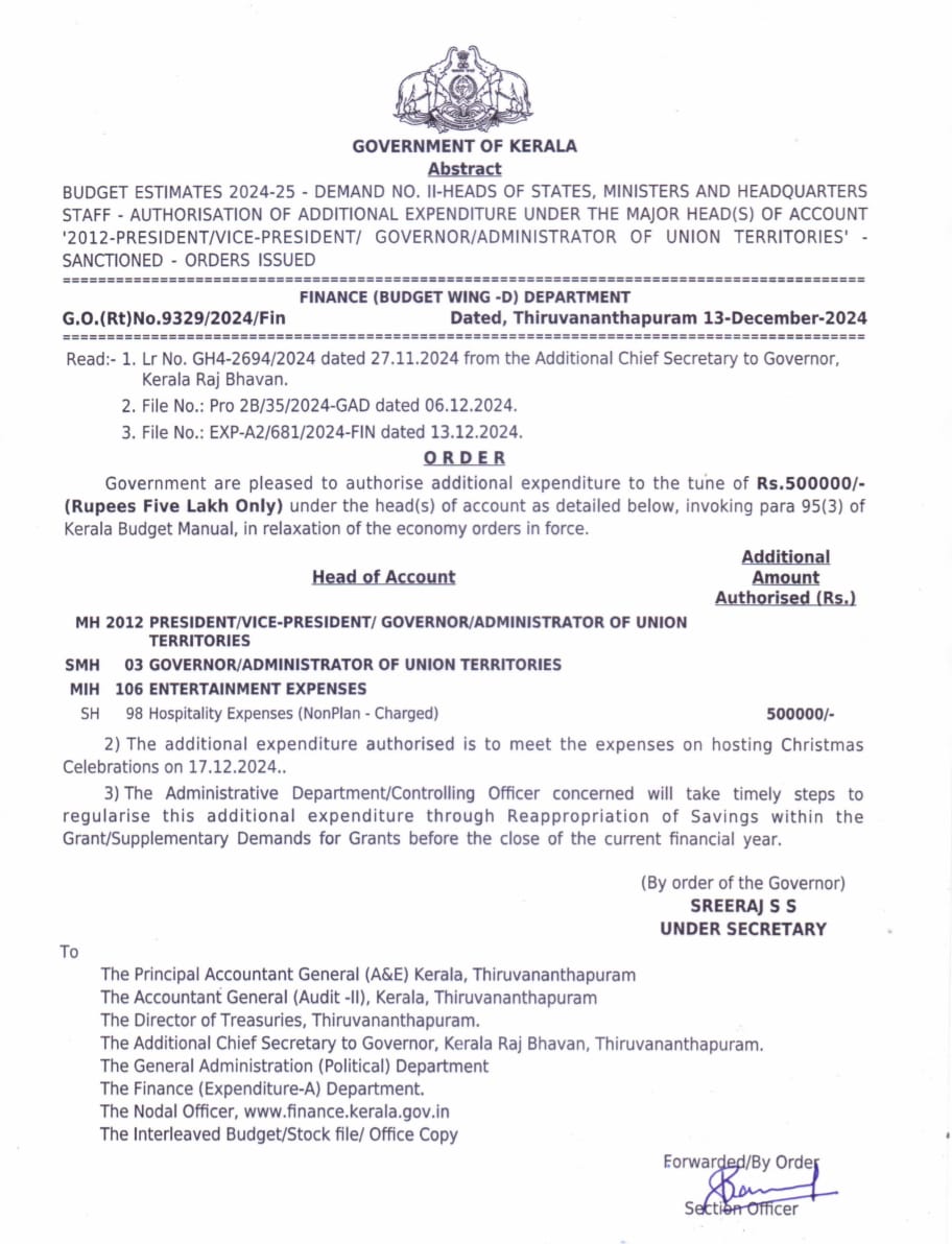 ഗവർണറുടെ ക്രിസ്മസ് വിരുന്ന്; 5 ലക്ഷം അനുവദിച്ച് ധനവകുപ്പ്