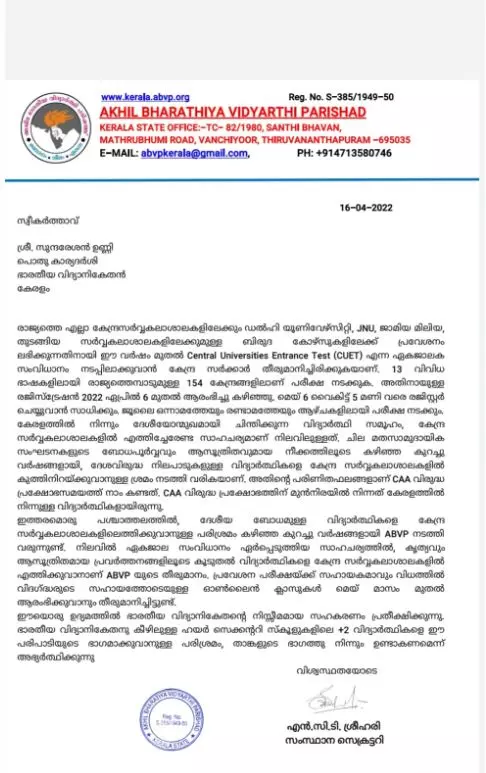 നിലവിൽ ഏകജാലക സംവിധാനം ഏർപ്പെടുത്തിയ സാഹചര്യത്തിൽ കൃത്യവും ആസൂത്രിതവുമായ പ്രവർത്തനങ്ങൡലൂടെ കൂടുതൽ വിദ്യാർത്ഥികളെ കേന്ദ്ര സർവകലാശാലകളിൽ എത്തിക്കാനാണ് എ.ബി.വി.പിയുടെ തീരുമാനമെന്നും കത്തിൽ അറിയിച്ചിട്ടുണ്ട്. പ്രവേശന പരീക്ഷയ്ക്ക് സഹായകമാവും വിധത്തിൽ വിദഗ്ധരുടെ സഹായത്തോടെയുള്ള ഓൺലൈൻ ക്ലാസുകൾ മേയ് മാസം മുതൽ ആരംഭിക്കും. ഭാരതീയ വിദ്യാനികേതനു കീഴിലുള്ള ഹയർ സെക്കൻഡറി സ്കൂളുകളിലെ പ്ലസ്ടു വിദ്യാർത്ഥികളെ പരിപാടിയുടെ ഭാഗമാക്കണമെന്നും ഇതിൽ ആവശ്യപ്പെടുന്നു.