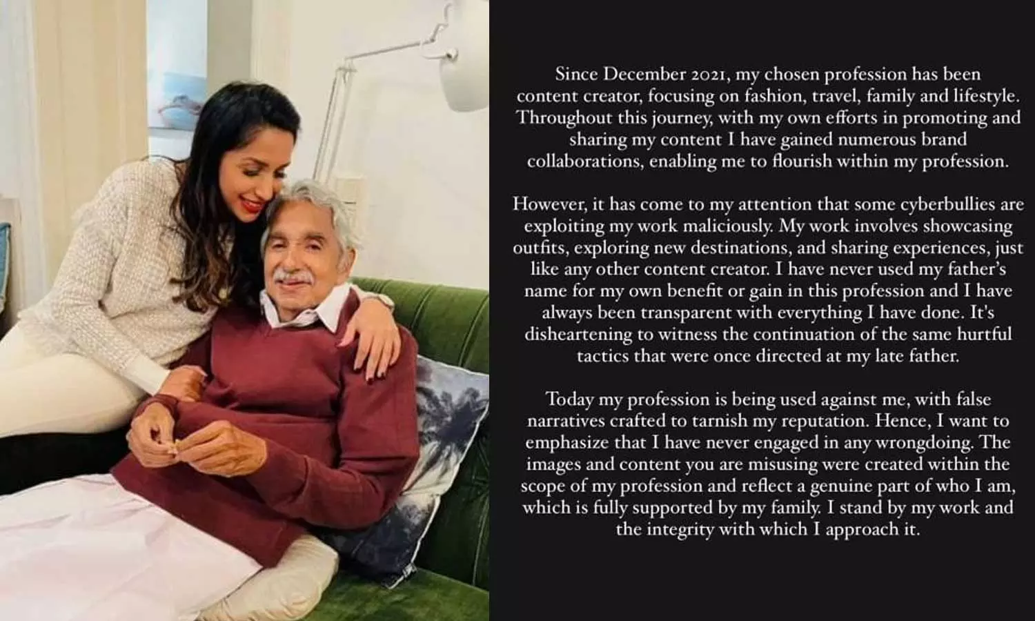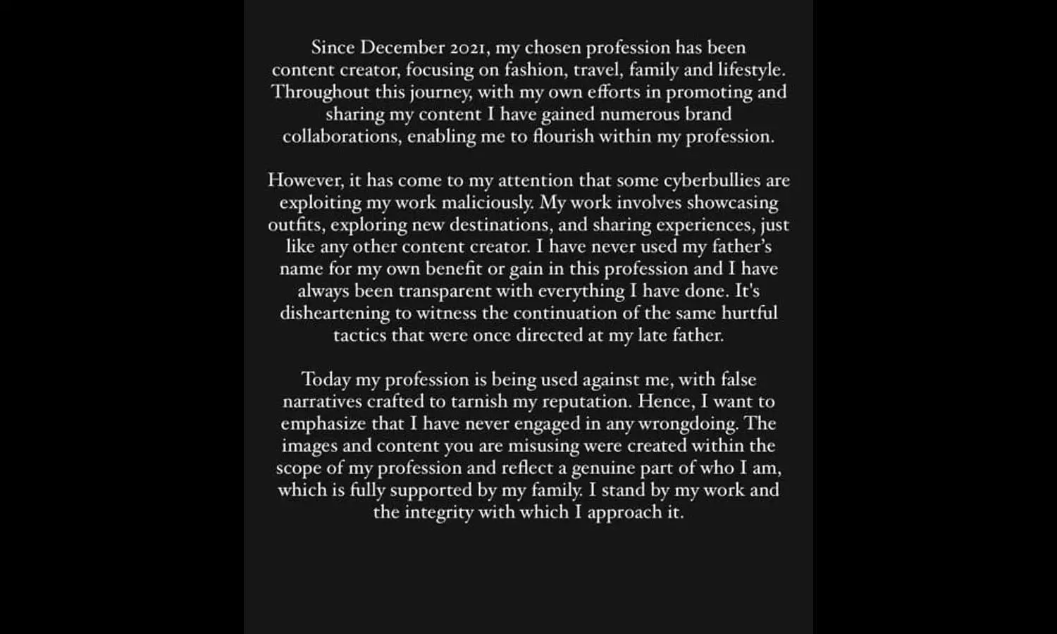 എന്നാൽ, കുറച്ചു ദിവസങ്ങളായി ചില സൈബർ പോരാളികൾ എന്റെ കരിയറുമായി ബന്ധപ്പെടുത്തി വ്യജപ്രചാരണങ്ങൾ നടത്തുന്നതു ശ്രദ്ധയിൽപ്പെട്ടിട്ടുണ്ട്. യശ്ശശരീനായ എന്റെ പിതാവിന്റെ സൽപ്പേരിനു കളങ്കമുണ്ടാക്കുന്ന തരത്തിലാണ് അവരുടെ ഇടപെടലുകൾ. ഇതു വളരെ നിരാശാജനകമാണ്.