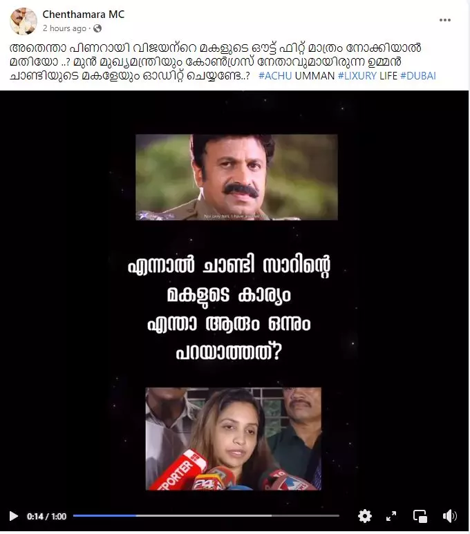 ചാണ്ടി ഉമ്മന്റെ സ്വത്തുവിവരങ്ങൾ ഉൾപ്പെടുത്തിയുള്ള പരിഹാസങ്ങൾക്കും കുറവില്ല. അച്ഛന്റെ തണലിലല്ലാതെ സ്വന്തമായി ജീവിക്കാനായി വീണാ വിജയൻ തുടങ്ങിയ കമ്പനിയെ കുറിച്ച് ആരോപണങ്ങളുന്നയിക്കുന്നവർ അച്ചു ഉമ്മന്റെ അത്യാഢംബര ജീവിതം കാണണമെന്നും നിരീക്ഷകരുടെ കണ്ണിൽ ഉമ്മൻ ചാണ്ടിയുടെ മകളുടെ ധൂർത്ത് ഒന്നും കാണില്ലെന്നുമാണ് മിക്ക പോസ്റ്റുകളിലും പറയുന്നത്.