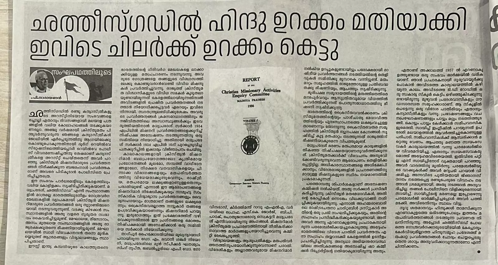 'മിഷണറിമാരുടെ മതപരിവർത്തന പദ്ധതികളെ കുറിച്ച് മധ്യപ്രദേശ് സർക്കാർ 1954 ല് നിയോഗിച്ച കമ്മിറ്റി ഗൗരവമുള്ള കണ്ടെത്തലുകള് നടത്തിയിട്ടുണ്ട്. നീതീകരിക്കാനാകാത്ത മാർഗങ്ങള് മിഷണറിമാർ മതം മാറ്റത്തിന് ഉപയോഗിക്കുന്നുവെന്നാണ് കമ്മിറ്റിയുടെ റിപ്പോർട്ട്. 19 ശിപാർശകളടങ്ങളടങ്ങിയ കമ്മിറ്റിയുടെ റിപ്പോർട്ട് മധ്യപ്രദേശ് സർക്കാർ പ്രസിദ്ധീകരിച്ചിട്ടുണ്ട്. ക്രിസ്ത്യന് മതമേധാവികള് ആ റിപ്പോർട്ടിന്റെ കോപ്പികള് വിലക്ക് വാങ്ങി നശിപ്പിച്ചു'- പി.നാരായണന് ലേഖനത്തില് ആരോപിക്കുന്നു.