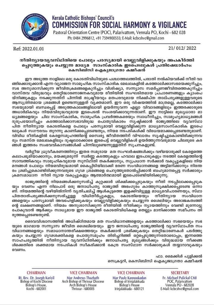 ദൈവവിശ്വാസത്തിൽ അധിഷ്ഠിതമായ മതസംവിധാനങ്ങളെയും കത്തോലിക്കാസഭയെയും സഭയുടെ ഭാഗമായ സന്ന്യാസ ജീവിതശൈലിയെയും ഈ ജനാധിപത്യ രാജ്യത്തിന്റെ വ്യവസ്ഥാപിത സംവിധാനങ്ങളെയും സമാധാനാന്തരീക്ഷത്തെയും തിരിച്ചറിഞ്ഞ് ഒറ്റപ്പെടുത്തുന്നതിനൊപ്പം, ഇന്നത്തെ സാഹചര്യത്തിൽ നീതിന്യായ വ്യവസ്ഥിതിക്കും ജനാധിപത്യമൂല്യങ്ങൾക്കും വിരുദ്ധമായ നീക്കങ്ങൾക്കെതിരെ ശക്തമായ നടപടികൾ സ്വീകരിക്കാൻ കേന്ദ്ര-സംസ്ഥാന സർക്കാരുകൾ തയാറാകുകയും വേണം.