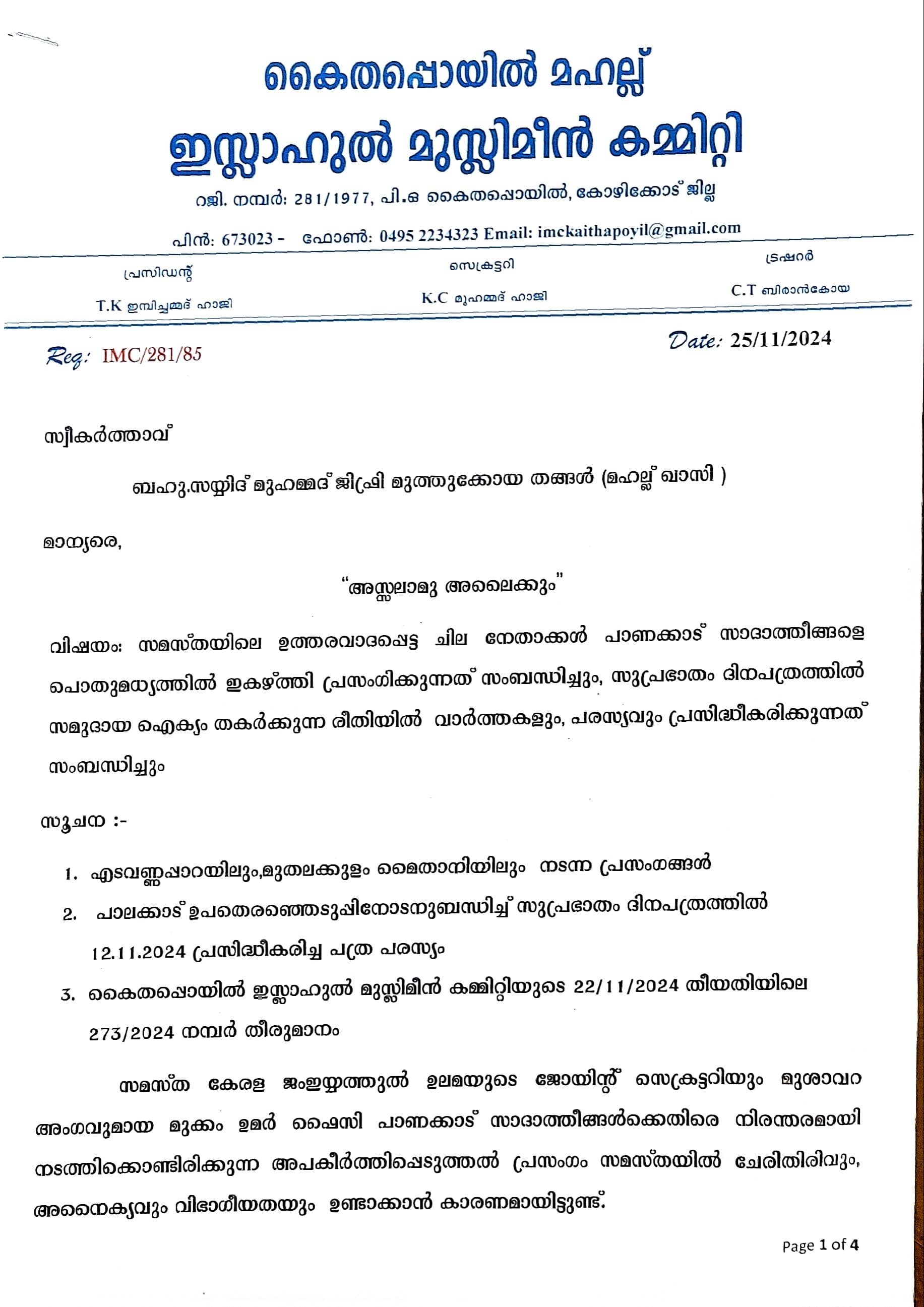 |സമസ്തയിലെ ചെറിയ വിഭാഗം നേതാക്കളുടെ വിഭാഗീയ പ്രവർത്തനം കൊണ്ട് അനൈക്യമുണ്ടായെന്ന് ജിഫ്രി തങ്ങള്ക്ക് അയച്ച കത്തിൽ മഹല്ല് കമ്മിറ്റി വ്യക്തമാക്കുന്നു