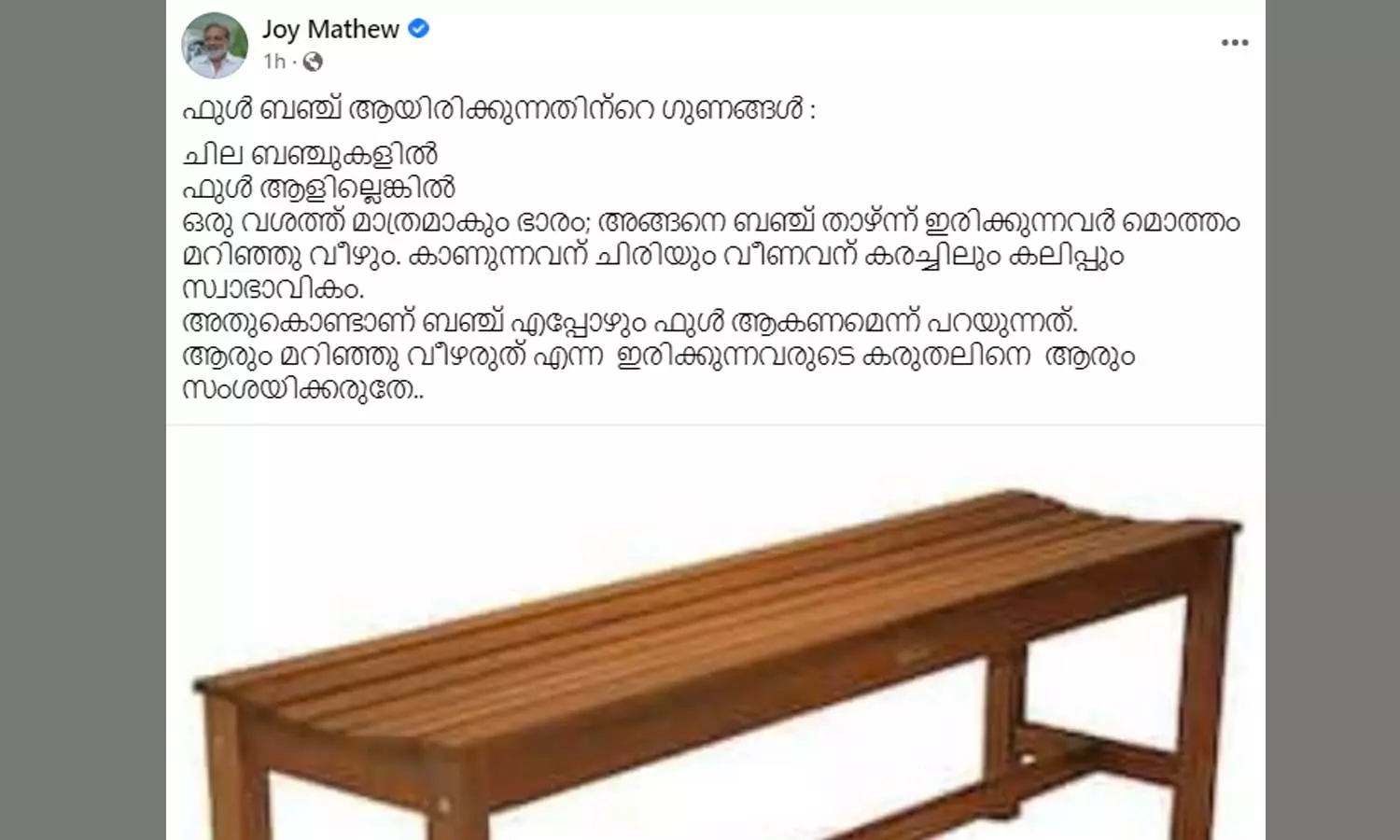 'ചില ബഞ്ചുകളിൽ ഫുൾ ആളില്ലെങ്കിൽ ഒരു വശത്ത് മാത്രമാകും ഭാരം. അങ്ങനെ ബഞ്ച് താഴ്ന്ന് ഇരിക്കുന്നവർ മൊത്തം മറിഞ്ഞു വീഴും. കാണുന്നവന് ചിരിയും വീണവന് കരച്ചിലും കലിപ്പും സ്വാഭാവികമാണെന്നും' ജോയ് മാത്യു കുറിച്ചു. ആരും മറിഞ്ഞു വീഴരുത് എന്ന ഇരിക്കുന്നവരുടെ കരുതലിനെ ആരും സംശയിക്കരുതേ.. എന്നു പറഞ്ഞാണ് ഫേസ്ബുക്ക് കുറിപ്പ് അവസാനിക്കുന്നത്.
