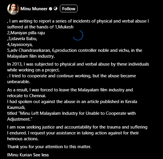 മുകേഷ്, മണിയൻപിള്ള രാജു, ജയസൂര്യ, ഇടവേള ബാബു ഉൾപ്പെടെയുള്ളവരിൽ നിന്ന് മാനസിതകമായും ശാരീരികമായും പീഡനം നേരിടേണ്ടി വന്നു എന്നായിരുന്നു നടി തന്റെ ഫേസ്ബുക്ക് പേജിലൂടെ വെളിപ്പെടുത്തിയത്.