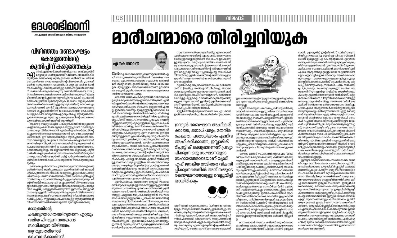തിരുവനന്തപുരം: കാന്തപുരം എ.പി അബൂബക്കർ മുസ്ലിയാരുടെ നേതൃത്വത്തിലുള്ള കേരള മുസ്ലിം ജമാഅത്തിനെ ‘കേരള ജമാഅത്തെ‘ എന്ന് വിശേഷിപ്പിച്ച് മുൻമന്ത്രിയും സിപിഎം നേതാവുമായ എ.കെ ബാലനും ദേശാഭിമാനിയും. ‘മാരീചന്മാരെ തിരിച്ചറിയുക‘ എന്ന തലക്കെട്ടിൽ ദേശാഭിമാനിയിൽ എഴുതിയ ലേഖനത്തിലാണ് എ.കെ ബാലൻ തെറ്റ് ആവർത്തിച്ചത്. ‘കേരള ജമാഅത്തെ‘യുടെ നേതൃത്വത്തിൽ എ.പി അബൂബക്കർ മുസ്ലിയാർ നടത്തിയ സംസ്ഥാന പ്രചാരണജാഥയുടെ സമാപനം ജനുവരി 16ന് തിരുവനന്തപുരത്ത് നടന്നെന്നും മുഖ്യമന്ത്രി പിണറായി വിജയനാണ് ഉദ്ഘാടനം ചെയ്തതെന്നും പറഞ്ഞാണ് ലേഖനം തുടങ്ങുന്നത്.