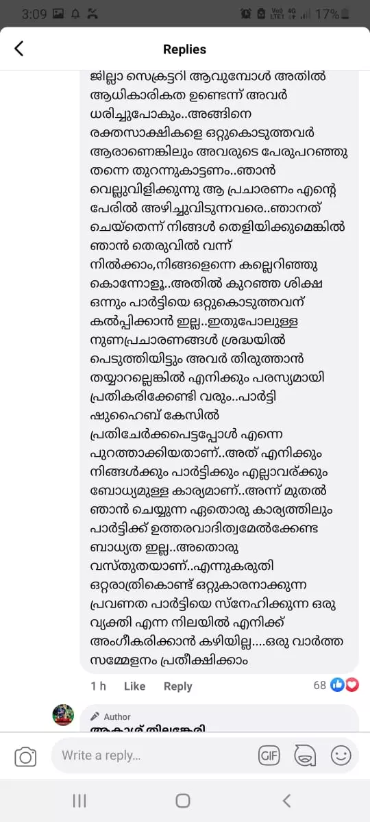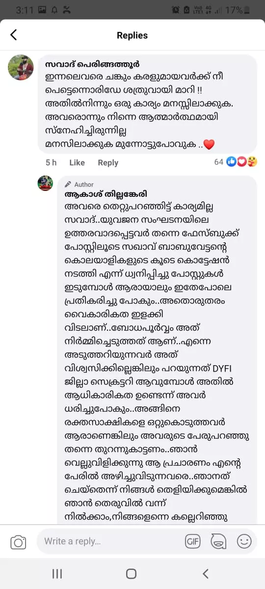 ആകാശ് തില്ലങ്കേരി അവസാനമിട്ട ഫെയ്സ്ബുക്ക് പോസ്റ്റിന് അടിയില് സവാദ് എന്നയാളുടെ ഒരു കമന്റിന് മറുപടിയായാണ് പാര്ട്ടി നേതൃത്വത്തെ ഭീഷണിപ്പെടുത്തുന്ന കുറിപ്പ്. കുറ്റപ്പെടുത്തുന്നവരെ തെറ്റുപറയാനാവില്ലെന്നും ഉത്തരവാദപ്പെട്ടവര് തന്നെ ഫെയ്സ്ബുക്ക് പോസ്റ്റിലൂടെ ബാബുവേട്ടന്റെ കൊലയാളികളുടെ കൂടെ കൊട്ടേഷന് നടത്തി എന്ന് പോസ്റ്റുകള് ഇടുമ്പോള് ആരായാലും ഇതുപോലെ പ്രതികരിച്ചുപോവും. ഇത് ഒരു തരം വൈകാരികത ഇളക്കിവിടലാണ്. ഡി.വൈ.എഫ്.ഐ ജില്ലാ സെക്രട്ടറി ആവുമ്പോള് പറയുന്നതില് ആധികാരികതയുണ്ടെന്ന് ധരിച്ചുപോവും.