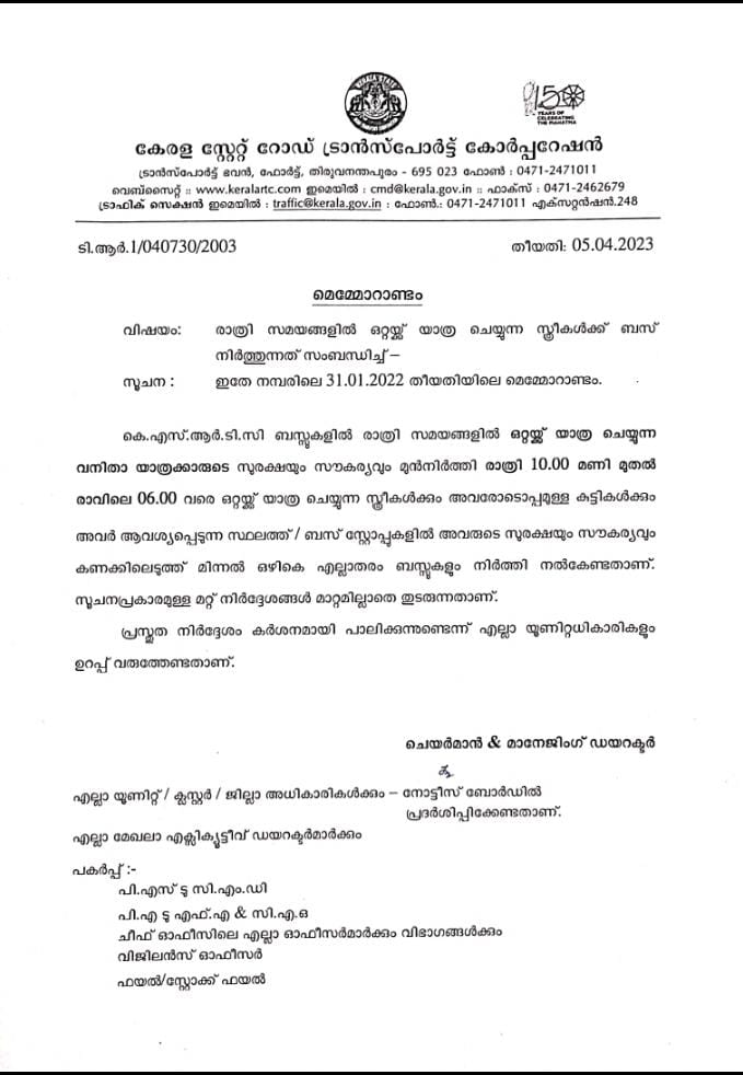 |രാത്രികാലങ്ങളിൽ കെ.എസ്.ആര്.ടി.സി ബസിൽ യാത്ര ചെയ്യുന്ന സ്ത്രീകളുടെ സുരക്ഷ കണക്കിലെടുത്താണ് തീരുമാനം