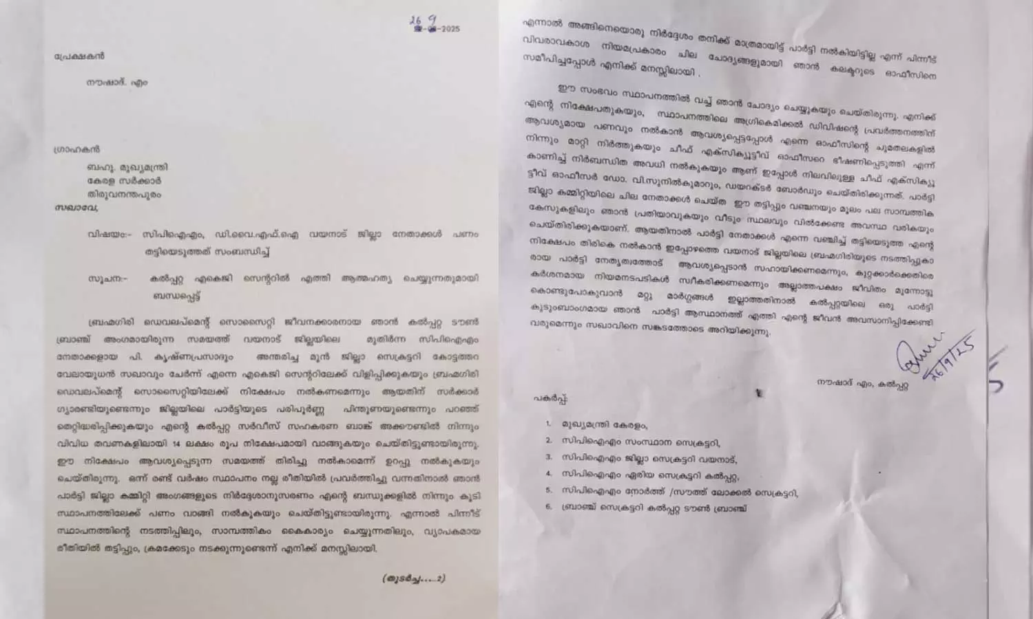'പണം തിരികെ നൽകിയില്ലെങ്കിൽ പാർട്ടി ഓഫീസിൽ ജീവനൊടുക്കേണ്ടി വരും'; ബ്രഹ്മഗിരി സൊസൈറ്റിയിൽ സാമ്പത്തിക ക്രമക്കേട് ആരോപണം
