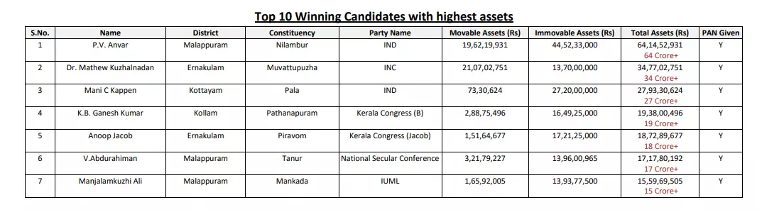 അതേസമയം കേരളത്തിലെ എംഎല്എമാരില് 55 ശതമാനം പേരുടെ ആസ്തി ഒരു കോടി രൂപയില് കൂടുതലാണ്. ഏറ്റവും കൂടുതല് സ്വത്തുള്ള എം.എല്.എ നിലമ്പൂരില് നിന്ന് ജയിച്ച പി.വി അന്വറാണ്. 64കോടി രൂപയാണ് അന്വറിന്റെ ആകെ ആസ്തി. രണ്ടാം സ്ഥാനത്തുള്ള കോണ്ഗ്രസ് എം.എല്.എ മാത്യൂ കുഴല്നാടന്റെ ആകെ സ്വത്ത് 34 കോടിയാണ്. മൂന്നാമത് പാലാ എംഎല്എ മാണി സി കാപ്പന് (27 കോടി) . പത്തനാപുരം എം.എല്.എ കെബി ഗണേഷ്കുമാറാണ് നാലാമത് (19 കോടി). പിറവം എംഎല്എ അനൂപ് ജേക്കബ് (18 കോടി) അഞ്ചാമതും മന്ത്രി വി. അബ്ദുറഹ്മാന് (17 കോടി) ആറാം സ്ഥാനത്തുമാണുള്ളത്.