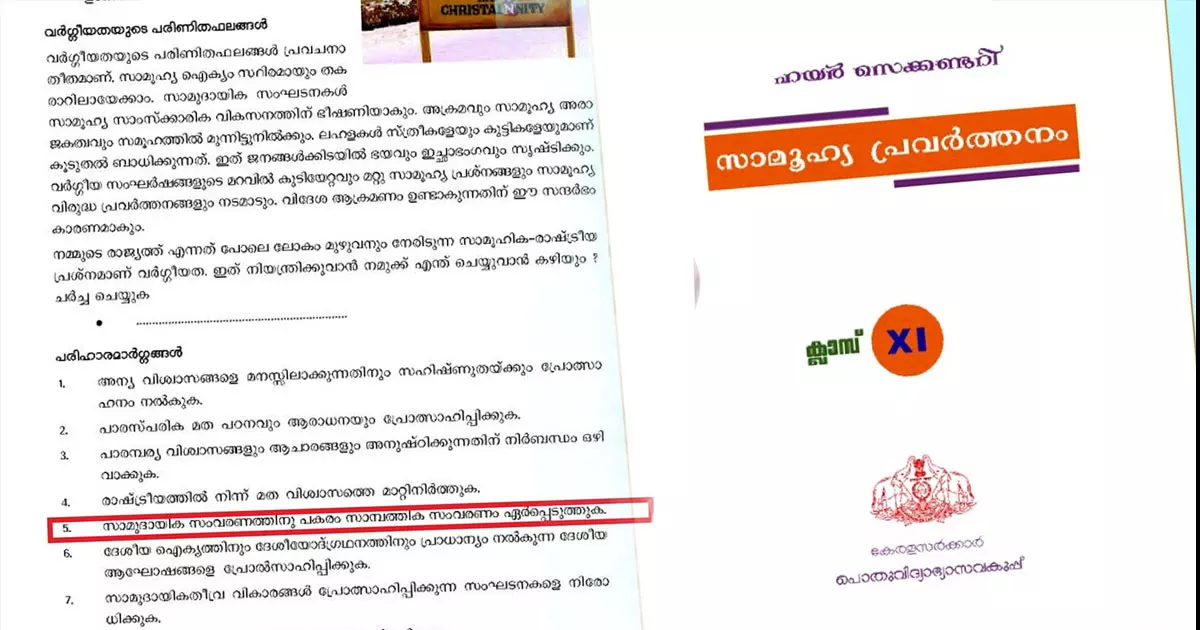 |വർഗീയത ഇല്ലാതാക്കാൻ സാമുദായിക സംവരണത്തിന് പകരം സാമ്പത്തിക സംവരണം നടപ്പാക്കണമെന്നാണ് പ്ലസ് വൺ സ്റ്റേറ്റ് സിലബസിലെ ഹ്യുമാനിറ്റീസ് പാഠപുസ്തകത്തിൽ നിർദേശിക്കുന്നത്