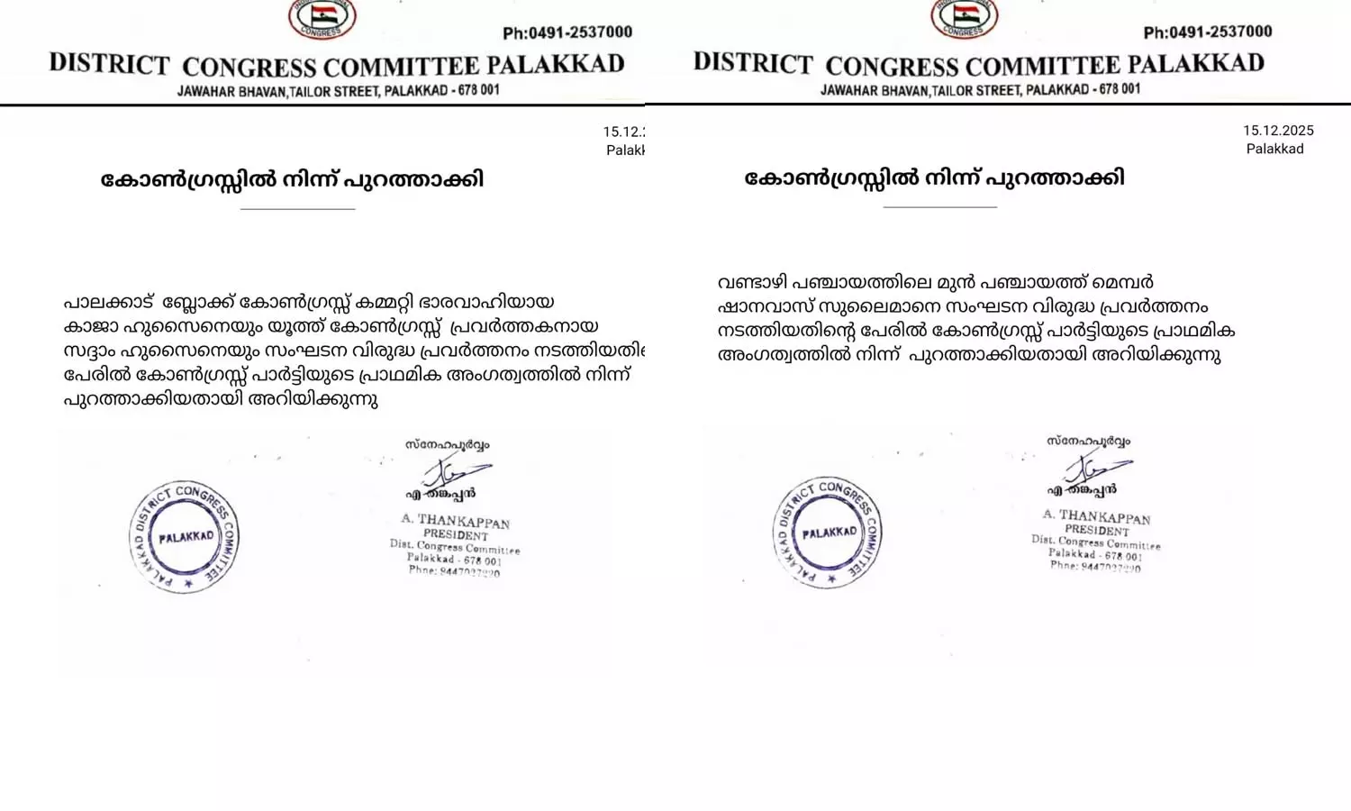 പാലക്കാട് ബ്ലോക്ക് കോൺഗ്രസ് അംഗം കാജാ ഹുസൈൻ ഉൾപ്പെടെ മൂന്നുപേരെ പാർട്ടിയിൽ നിന്ന് പുറത്താക്കി