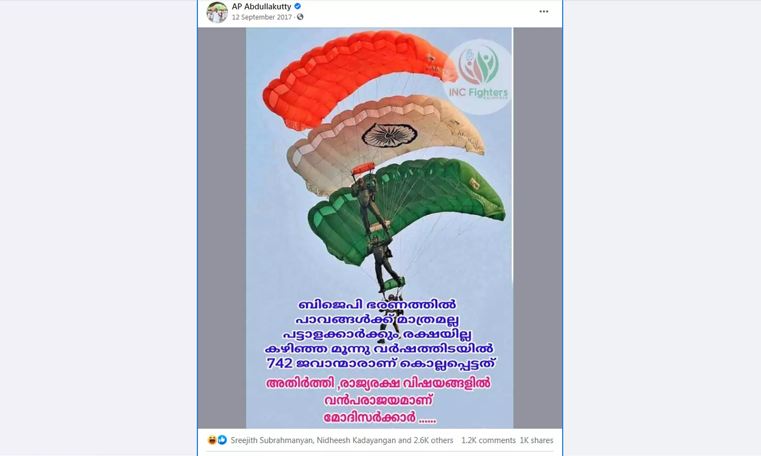 ഇത്തരത്തിൽ നിരവധി ചിത്രങ്ങളും എഴുത്തുകളുമാണ് കോൺഗ്രസിനെ പുകഴ്ത്തിയും ബിജെപി വിമർശിച്ചും അബ്ദുല്ലക്കുട്ടിയുടെ പേജിലുള്ളത്.