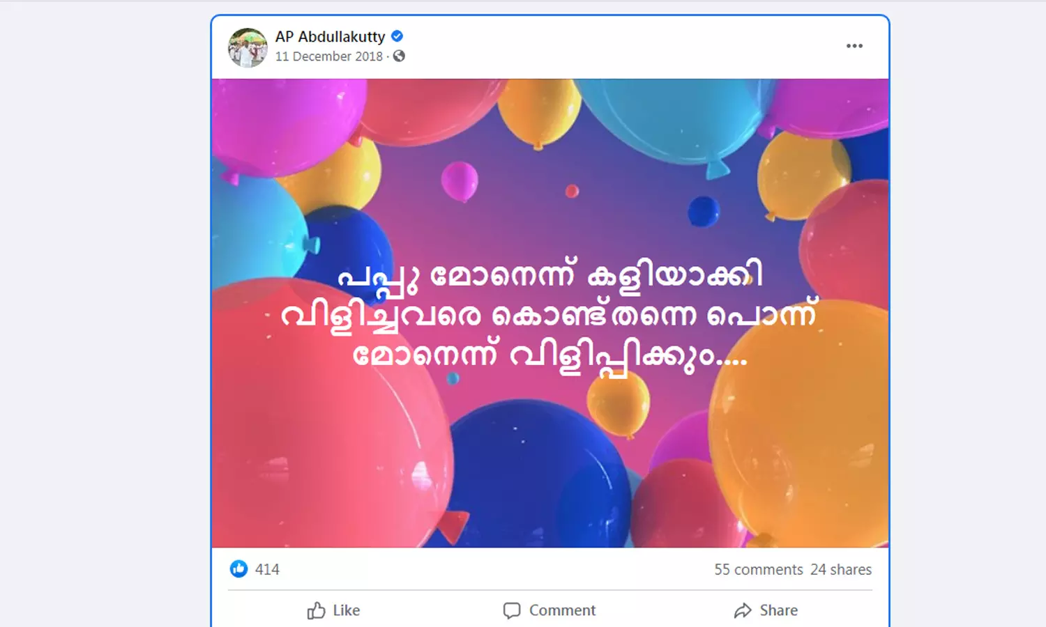 |കോൺഗ്രസിലായിരുന്നപ്പോൾ അബ്ദുല്ലക്കുട്ടി സ്വന്തം പേജിൽ ബിജെപിയെ വിമർശിച്ച് പോസ്റ്റ് ചെയ്ത പോസ്റ്റുകളാണ് ഇപ്പോൾ ചിലർ കമന്റിട്ട് ' കുത്തിപ്പൊക്കുന്നത്'.