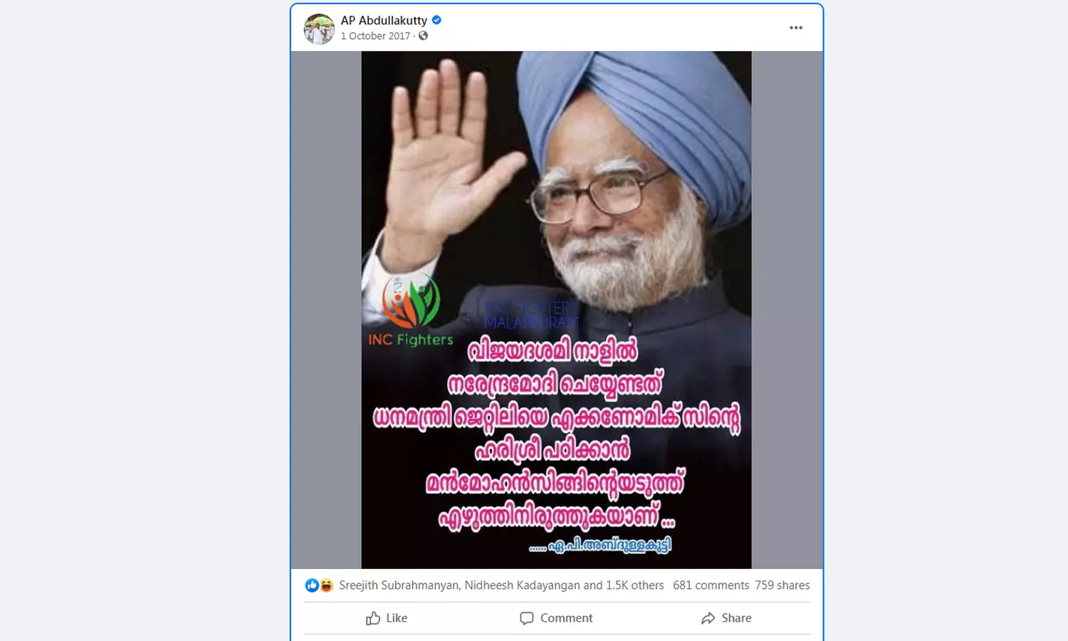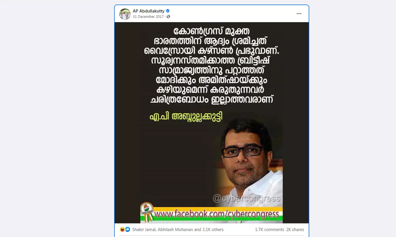 'കോൺഗ്രസ് മുക്തഭാരതത്തിന് ആദ്യം ശ്രമിച്ചത് വൈസ്രോയി കഴ്സൺ പ്രഭുവാണ്. സൂര്യനസ്തമിക്കാത്ത ബ്രിട്ടീഷ് സാമ്രാജ്യത്തിന് പറ്റാത്തത് മോദിക്കും അമിത് ഷായ്ക്കും കഴിയുമെന്ന് കരുതുന്നവർ ചരിത്രബോധം ഇല്ലാത്തവരാണ്'- 2017 ഡിസംബർ 31 ലെ ഒരു പോസ്റ്റാണിത്. രാഹുല് ഗാന്ധിയേയും മന്മോഹന് സിങിനെയും പിന്തുണച്ചുള്ള പോസ്റ്റുകളും ചിലര് കുത്തിപ്പൊക്കുന്നുണ്ട്.