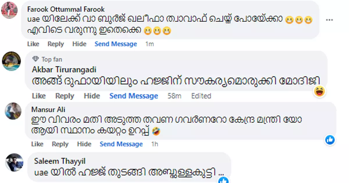 രസകരമായ കമന്റുകളാണ് ഈ വാർത്തയ്ക്ക് താഴെ നിറയുന്നത്. 'ബുർജ് ഖലീഫയിൽ ത്വവാഫ് ചെയ്യാനും സൗകര്യം ഒരുക്കണം ജീ', 'എന്തു കരുതലാണ് ആ മൻസന്, ഗ്യാസിന് 100ന് മുകളിലായി', 'തൽക്കാലം ഹജ്ജ് യുഎഇയിലേക്ക് മാറ്റിയിരിക്കുന്നു'- എന്നിങ്ങനെ പോകുന്നു കമന്റുകൾ.