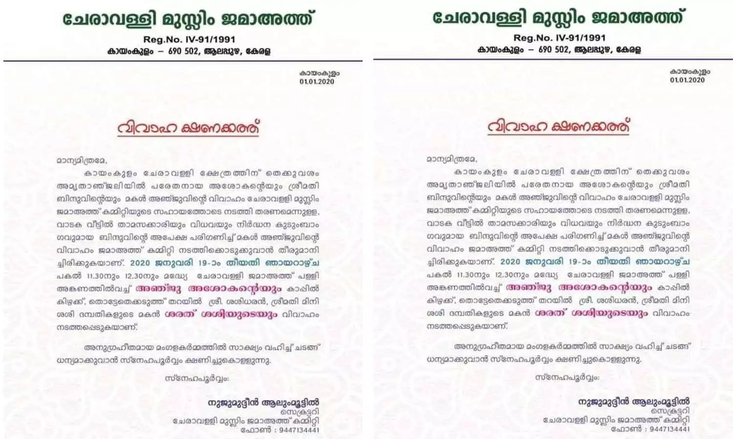 2022 ജനുവരി 19നായിരുന്നു കായംകുളം ചേരാവള്ളിയിൽ മുസ്ലിം ജമാഅത്ത് കമ്മിറ്റിയുടെ കാർമികത്വത്തിൽ അഞ്ജു-ശരത് ദമ്പതികളുടെ വിവാഹം നടന്നത്. കല്യാണത്തിന്റെ രണ്ട് വർഷം മുമ്പ് അഞ്ജുവിന്റെ പിതാവ് അശോകൻ ഹൃദയാഘാതം മൂലം മരിച്ചിരുന്നു. ഇതോടെ കുടുംബം വലിയ സാമ്പത്തിക പ്രതിസന്ധിയിലായി. തുടർന്നാണ് അഞ്ജുവിന്റെ കല്യാണം ജമാഅത്ത് കമ്മിറ്റിയുടെ നേതൃത്വത്തിൽ നടത്തിയത്.
