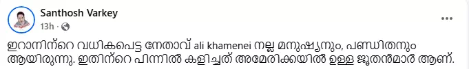 ഇറാനിലെ പരമോന്നത നേതാവായിരുന്ന ആയത്തുല്ല അലി ഖാംനഈ വളരെ നല്ല മനുഷ്യനും പണ്ഡിതനുമായിരുന്നു എന്നാണ് ആറാട്ടണ്ണൻ പറയുന്നത്. അമേരിക്കയ്ക്ക് ന്യൂക്ലിയർ ആയുധങ്ങളാവാം, എന്നാൽ ഇറാന് പാടില്ല എന്ന് പറയുന്നതിലെ ഇരട്ടത്താപ്പും അദ്ദേഹം ചോദ്യം ചെയ്യുന്നു. ഏതായാലും ഇസ്രായേൽ-ഇറാൻ യുദ്ധത്തിൽ ഒരു കാരണവശാലും ഇസ്രായേലിനെ സപ്പോർട്ട് ചെയ്യരുതെന്ന് അദ്ദേഹം തന്റെ ഫോളോവേഴ്സിന് കർശന നിർദ്ദേശം നൽകിയിട്ടുണ്ട്.