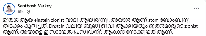 ശാസ്ത്രലോകം ഇത്രകാലം വിശ്വസിച്ചിരുന്നത് ആൽബർട്ട് ഐൻസ്റ്റീൻ ഒരു മഹാബുദ്ധിമാനായിരുന്നു എന്നാണ്. എന്നാൽ ആറാട്ടണ്ണൻ അത് തള്ളുന്നു. ഐൻസ്റ്റീൻ വെറുമൊരു സയണിസ്റ്റ് വാദിയായിരുന്നുവെന്നും, അദ്ദേഹത്തെ വലിയ ബുദ്ധിജീവിയാക്കിയത് സയണിസ്റ്റുകളാണെന്നുമാണ് പുതിയ വെളിപ്പെടുത്തൽ. ആറ്റം ബോംബിന് തുടക്കം കുറിച്ച ഈ 'സാധാരണക്കാരനെ' ഇസ്രായേൽ പ്രസിഡന്റ് ആക്കാൻ വരെ അവർ നോക്കിയെന്ന് അണ്ണൻ പറയുന്നു.