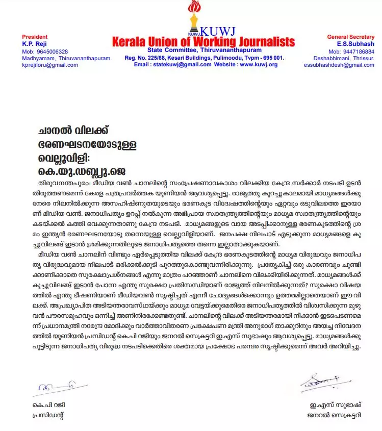 |ചാനലിന്റെ വിലക്ക് അടിയന്തരമായി നീക്കാൻ ഇടപെടണമെന്ന് പ്രധാനമന്ത്രി നരേന്ദ്ര മോദിക്കും വാർത്താവിതരണ പ്രക്ഷേപണ മന്ത്രി അനുരാഗ് താക്കൂറിനും അയച്ച നിവേദനത്തിൽ കെ.യു.ഡബ്ല്യു.ജെ പ്രസിഡന്റ് കെ.പി റജിയും ജനറൽ സെക്രട്ടറി ഇ.എസ് സുഭാഷും ആവശ്യപ്പെട്ടു