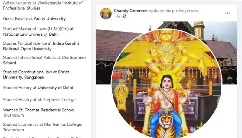 തെരഞ്ഞെടുപ്പ് ഫലം വരാന് ഒരു ദിവസം മാത്രം ബാക്കി നില്ക്കെയാണ് ചാണ്ടി ഉമ്മന് ഫേസ്ബുക്കിലെ മുഖചിത്രം മാറ്റിയത്. ഇതിന് മുമ്പ് തന്നെ ചാണ്ടി ഉമ്മന്റെ കവര് ചിത്രം ശബരിമല ആയിരുന്നു.