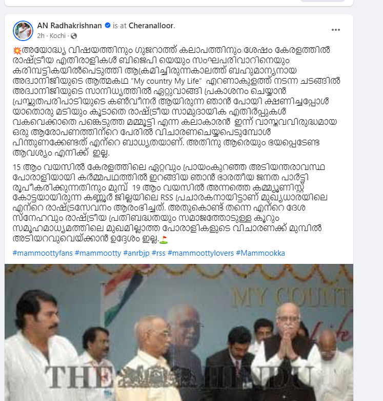 അയോദ്ധ്യ വിഷയത്തിനും ഗുജറാത്ത് കലാപത്തിനും ശേഷം കേരളത്തിൽ രാഷ്ട്രീയ എതിരാളികൾ ബിജെപി യെയും സംഘപരിവാറിനെയും കരിമ്പട്ടികയിൽപെടുത്തി ആക്രമിച്ചിരുന്നകാലത്ത് ബഹുമാന്യനായ അദ്വാനിജിയുടെ ആത്മകഥ “My country My Life“ എറണാകുളത്ത് നടന്ന ചടങ്ങിൽ അദ്വാനിജിയുടെ സാനിധ്യത്തിൽ ഏറ്റുവാങ്ങി പ്രകാശനം ചെയ്യാൻ പ്രസ്തുതപരിപാടിയുടെ കൺവീനർ ആയിരുന്ന ഞാൻ പോയി ക്ഷണിച്ചപ്പോൾ യാതൊരു മടിയും കൂടാതെ രാഷ്ട്രീയ സാമുദായിക എതിർപ്പുകൾ വകവെക്കാതെ പങ്കെടുത്ത മമ്മൂട്ടി എന്ന കലാകാരൻ ഇന്ന് വാസ്തവവിരുദ്ധമായ ഒരു ആരോപണത്തിന്റെ പേരിൽ വിചാരണചെയ്യപെടുമ്പോൾ പിന്തുണക്കേണ്ടത് എന്റെ ബാധ്യതയാണ്. അതിനു ആരെയും ഭയപ്പെടേണ്ട ആവശ്യം എനിക്ക് ഇല്ല.