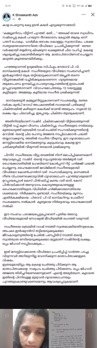 ഇതിനെതിരെ സിപിഎം നേതാവിനെ പിന്തുണച്ചാണ് ബിജെപി നേതാവ് രംഗത്തെത്തിയിരിക്കുന്നത്. സംഗീതയെ ബ്രെയിൻ വാഷ് നടത്തി സ്വന്തമാക്കിയതിനുശേഷം അപകട ഇൻഷുറൻസ് തട്ടിയെടുക്കുകയോ ജീവകാരുണ്യത്തിന്റെ പേരിൽ പണപ്പിരിവ് നടത്തി തൻ്റെ സ്വാർത്ഥത നേടിയെടുക്കുകയോ മറ്റുമാണ് റാഷിദിൻ്റെ ലക്ഷ്യം. ഒപ്പം ജിഹാദ് നടപ്പിലാക്കുക. ഇത് മനസ്സിലാക്കാതെ വീഡിയോ പ്രചരിപ്പിച്ച് വാർത്ത പടച്ചു വിടുന്നവർ അറിയുന്നില്ല വേദനിക്കുന്ന മാതാപിതാക്കളുടെ വിഷമം.ഇത്രയുമായിട്ടും ആ മകളെ ചേർത്തു പിടിക്കുന്ന ആ മാതാപിതാക്കളെ സമൂഹം ചേർത്തു പിടിക്കണം. ഒപ്പം ജിഹാദി അജണ്ട തിരിച്ചറിയണമെന്നുമാണ് എൻ്റെ അഭ്യർത്ഥന. കൂടാതെ ഇതിൻ്റെ പിന്നിലുള്ള മുഴുവൻ ഗൂഢാലോചനയും പുറത്തുകൊണ്ടുവരണമെന്നും ആവശ്യപ്പെടുകയാണെന്നും ഫേസ്ബുക്ക് പോസ്റ്റിൽ പറയുന്നു.