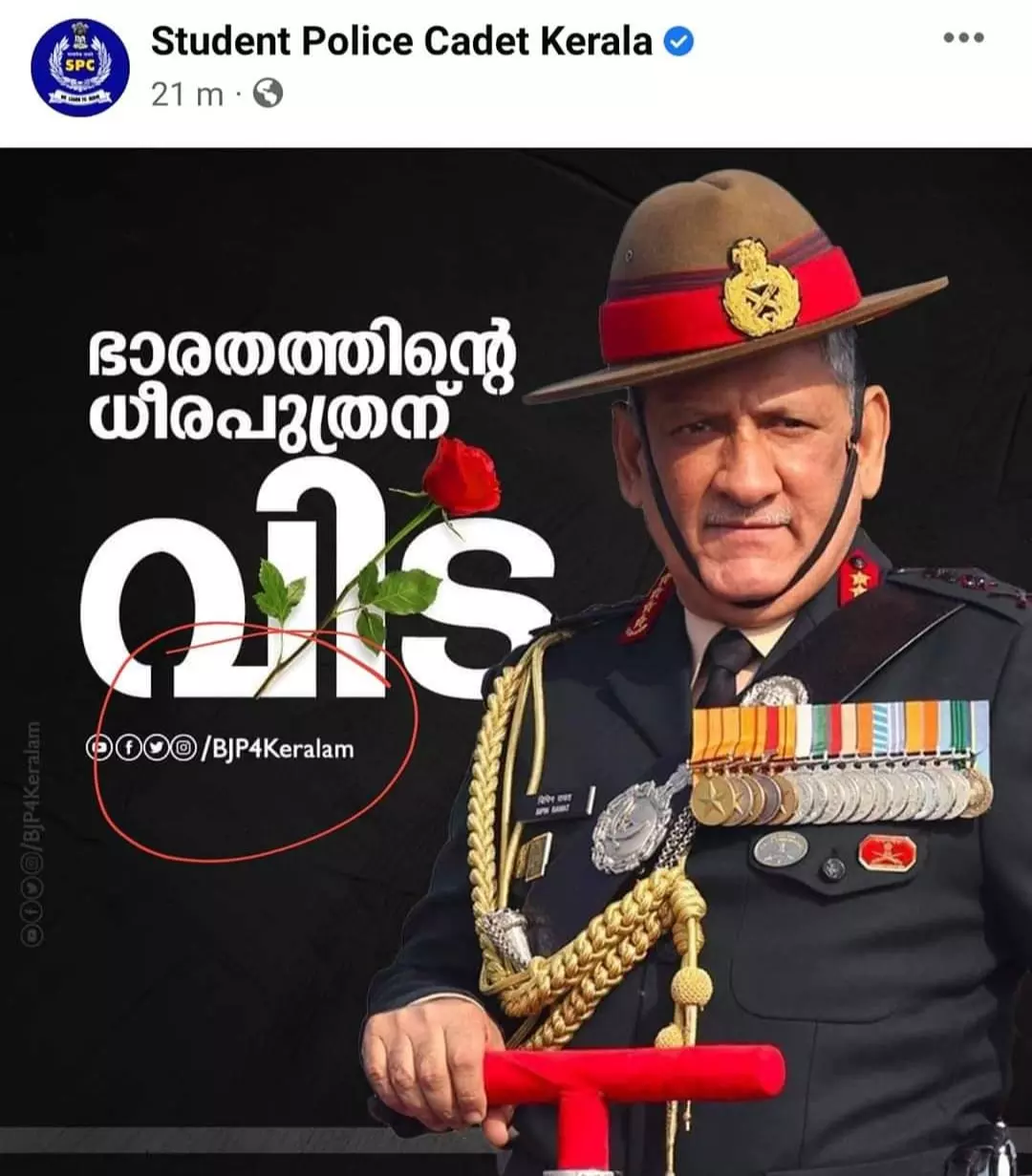 കേരള പൊലീസിന് കീഴിൽ പ്രവർത്തിക്കുന്ന സ്റ്റുഡന്റ് പൊലീസ് കേഡറ്റിന്റെ ഔദ്യോഗിക ഫേസ്ബുക്ക് പേജിൽ ബി.ജെ.പി പോസ്റ്റർ. സംയുക്ത സേന മേധാവി ബിപിൻ റാവത്തിന് ആദരാഞ്ജലികൾ അർപ്പിച്ച് കൊണ്ടുള്ള ബി.ജെ.പി കേരള ഘടകത്തിന്റെ പോസ്റ്ററാണ് സ്റ്റുഡന്റ് പൊലീസ് കേഡറ്റ് പേജിൽ പോസ്റ്റ് ചെയ്തത്.