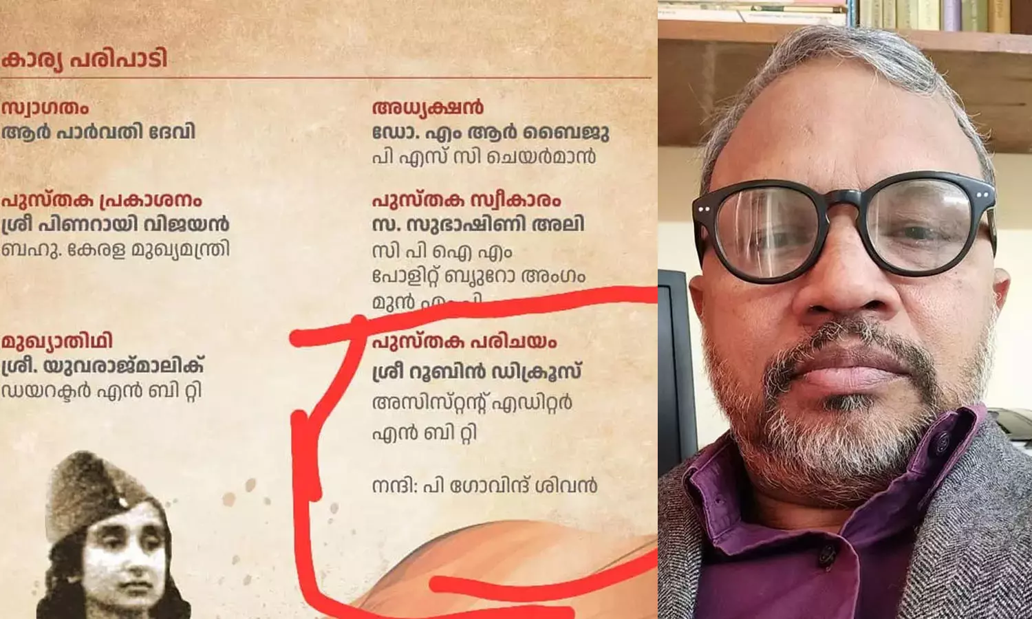 |ക്യാപ്റ്റന് ലക്ഷ്മിയുടെ ജീവചരിത്രം പറയുന്ന പുസ്തകത്തിന്റെ പ്രകാശന ചടങ്ങിലേക്കാണ് എന്ബിറ്റിയുടെ അസിസ്റ്റന്റ് എഡിറ്റര് റൂബിന് ഡിക്രൂസിനെ ക്ഷണിച്ചത്