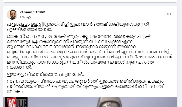 മാധ്യമപ്രവർത്തകൻ വഹീദ് സമാൻ കുറിച്ചത് ഇപ്രകാരം; 'ജെങ്കിസ് ഖാൻ ഇസ്ലാമിലേക്ക് ആളെ കൂട്ടാൻ വേണ്ടി ആളുകളെ പച്ചക്ക് തൊലിയുരിച്ചു കൊന്നുവെന്ന് പറയുന്ന് സി. രവിചന്ദ്രൻ എന്ന യുക്തിവാദികളുടെ ദൈവമാണ്. ഇയാളൊക്കെയാണ് ആഗോള ബുദ്ധികേന്ദ്രമായി ചമഞ്ഞു നടക്കുന്നത്. ജെങ്കിസ് ഖാൻ എന്ന് വെറുതെ സെർച്ച് ചെയ്തുനോക്കിയാൽ പോലും ആരായിരുന്നു അയാൾ എന്ന് നിമിഷനേരം കൊണ്ട് മനസിലാകും. ആ സൗകര്യം നിലനിൽക്കെയാണ് ഇയാൾ നുണ പറഞ്ഞ് നടക്കുന്നത്.'
