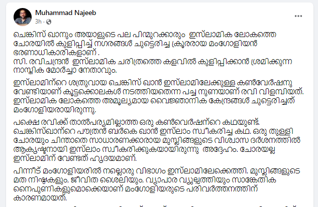 മുഹമ്മദ് നജീബ് കുറിച്ചതിപ്രകാരം; 'ഇസ്ലാമിന്റെ ശത്രുവായ ചെങ്കിസ് ഖാൻ ഇസ്ലാമിലേക്കുള്ള കൺവേർഷനു വേണ്ടിയാണ് കൂട്ടക്കൊലകൾ നടത്തിയതെന്ന പച്ച നുണയാണ് രവി വിളമ്പിയത്. ഇസ്ലാമിക ലോകത്തെ അമൂല്യമായ വൈജ്ഞാനിക കേന്ദ്രങ്ങൾ ചുട്ടെരിച്ചത് മംഗോളിയരായിരുന്നു.