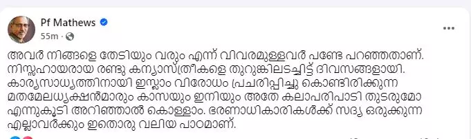 അവർ നിങ്ങളെ തേടിയും വരും എന്ന് വിവരമുള്ളവർ പണ്ടേ പറഞ്ഞതാണ്. നിസ്സഹായരായ രണ്ടു കന്യാസ്ത്രീകളെ തുറുങ്കിലടച്ചിട്ട് ദിവസങ്ങളായെന്നും എഴുത്തുകാരനും തിരക്കഥാകൃത്തുമായ പി.എഫ് മാത്യൂസ്