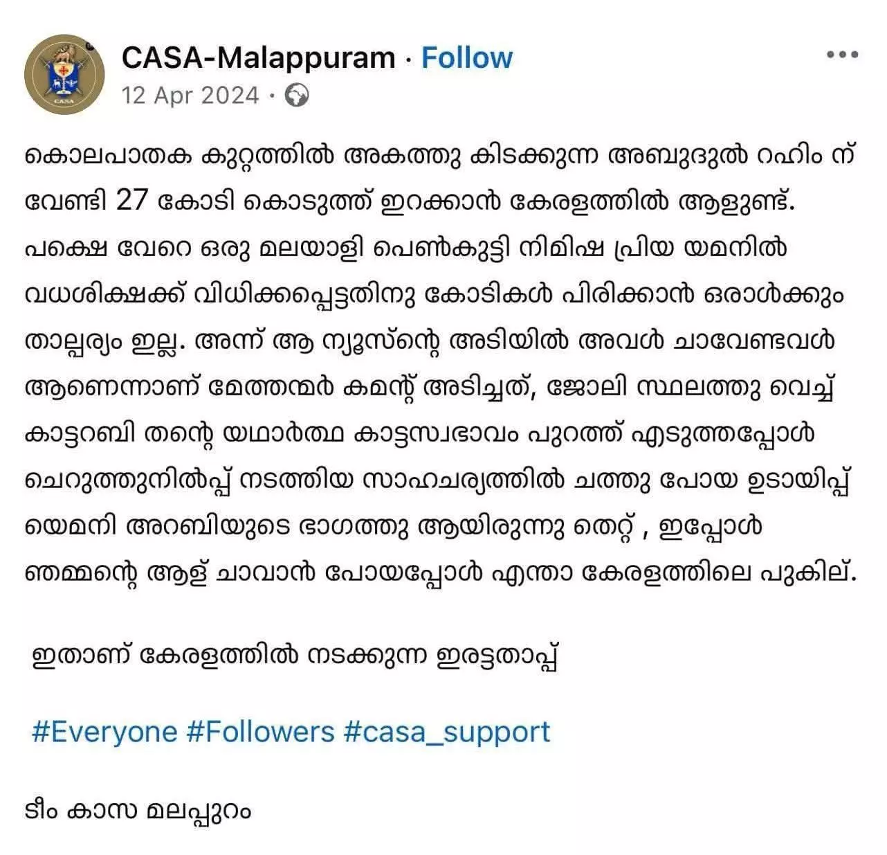 2024 ഏപ്രിൽ 12ന് കാസ പറഞ്ഞത് ' കോടികൾ കൊടുത്ത് റഹീമിനെ ഇറക്കാൻ ആളുണ്ട്. നിമിഷപ്രിയക്കായി പിരിക്കാൻ ഒരാൾക്കും താൽപര്യമില്ല. ഇതാണ് ഇരട്ടത്താപ്പ് എന്നാണ്'. കാസ മലപ്പുറത്തിന്റെ ഫേസ്ബുക്ക് പേജിലാണ് പോസ്റ്റ്. സൗദി ബാലന്റെ മരണവുമായി ബന്ധപ്പെട്ട് റിയാദ് ജയിലിൽ കഴിയുന്ന അബ്ദുൽ റഹീമിന്റെ മോചനത്തിനായി പണം സ്വരൂപിച്ച സാഹചര്യത്തിലാണ് ഈ പ്രസ്താവന.