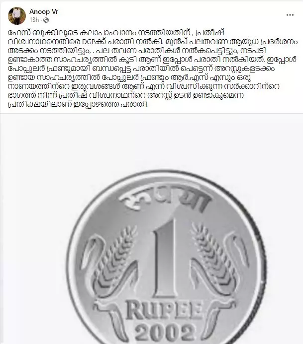 പോപ്പുലർ ഫ്രണ്ടും ആർ.എസ് എസും ഒരു നാണയത്തിന്റെ ഇരുവശങ്ങൾ ആണ് എന്ന് വിശ്വസിക്കുന്ന സർക്കാറിന്റെ ഭാഗത്ത് നിന്ന് പ്രതീഷ് വിശ്വനാഥന്റെ അറസ്റ്റ് ഉടൻ ഉണ്ടാകുമെന്ന് പ്രതീക്ഷിക്കുന്നതായി അനൂപ് ഫേസ്ബുക്കിൽ കുറിച്ചു.