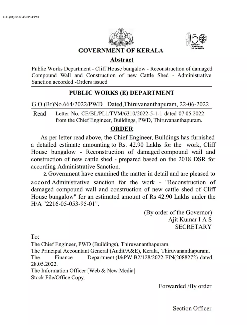 ക്ലിഫ് ഹൗസിൽ കാലിത്തൊഴുത്ത് നിർമിക്കാനും ചുറ്റുമതിൽ പുനർനിർമിക്കുന്നതിനും 42.90 ലക്ഷം