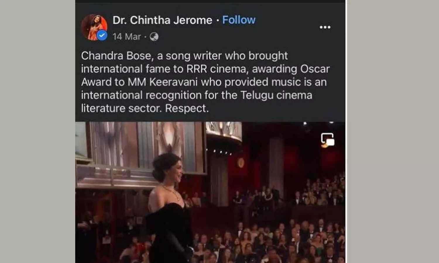Chandra Bose, a song writer who brought international fame to RRR cinema, awarding Oscar Award to MM Keeravani who provided music is an international recognition for the Telugu cinema literature sector. Respect. എന്നാണ് ചിന്തയുടെ ഫേസ്ബുക്ക് പോസ്റ്റ്. ഇത് മലയാളത്തിലേക്ക് വിവർത്തനം ചെയ്താൽ,