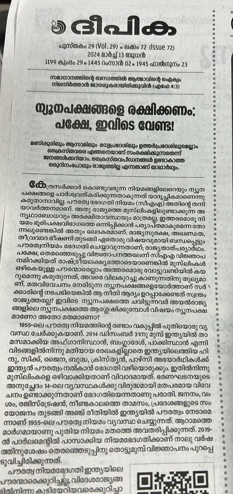 മുസ്ലിംകളോട് വിവേചനം കാട്ടുന്ന പൗരത്വ നിയമഭേദഗതിയെ വിമർശിച്ച് സിറോ മലബാർ സഭാ മുഖപത്രമായ ദീപികയില് മുഖപ്രസംഗം. ‘ന്യൂനപക്ഷങ്ങളെ രക്ഷിക്കണം; പക്ഷേ, ഇവിടെ വേണ്ട’ എന്ന തലക്കെട്ടില് എഴുതിയ മുഖപ്രസംഗത്തില് നിയമത്തിന്റെ ഭരണഘടനാ വിരുദ്ധതയെയും കേന്ദ്രസർക്കാരിന്റെ ഉദ്ദേശ ശുദ്ധിയെയും ചോദ്യം ചെയ്യുന്നു.