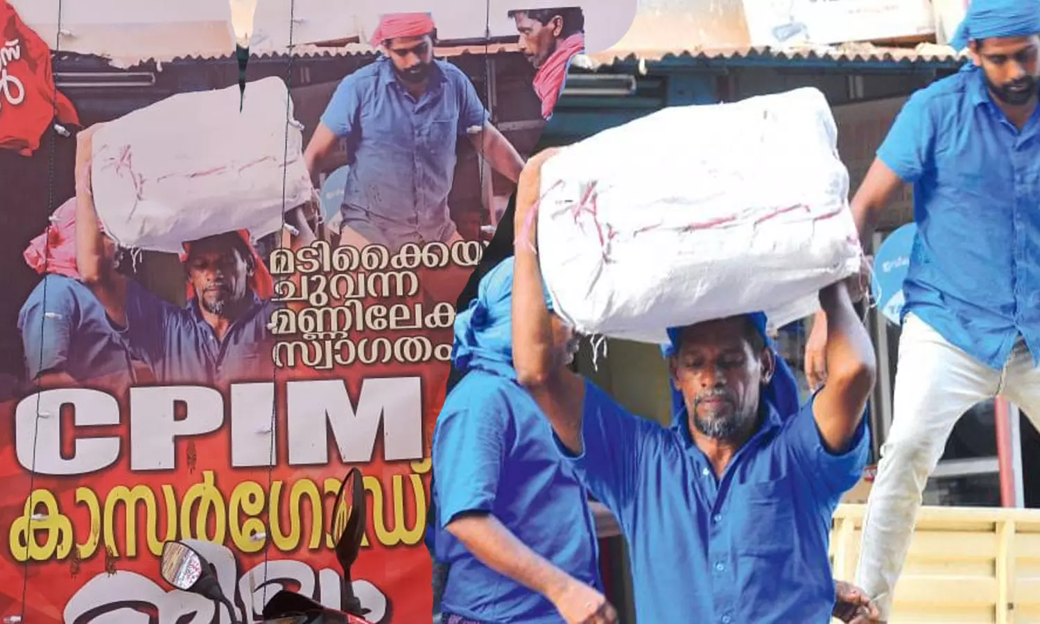 മടിക്കൈയിൽ നടന്ന സി.പി.എം ജില്ലാ സമ്മേളനത്തിലേക്ക് പ്രതിനിധികളെ സ്വാഗതം ചെയ്യുന്ന ബോർഡിലെ ചുമടെടുക്കുന്ന തൊഴിലാളികൾ കാസർകോട് നഗരത്തിലെ എസ്.ടി.യു അംഗങ്ങളായ ചുമട്ട് തൊഴിലാളികൾ. മുസ്ലിം ലീഗിന്റെ തൊഴിലാളിസംഘടനയാണ് എസ്.ടി.യു. തൊഴിലാളികളുടെ യഥാർത്ഥ ഫോട്ടോയിലെ നീല നിറത്തിലുള്ള തലപ്പാവിന് ചുവപ്പ് കളർ നൽകിയാണ് ബോർഡിൽ ചേർത്തിരിക്കുന്നത്.