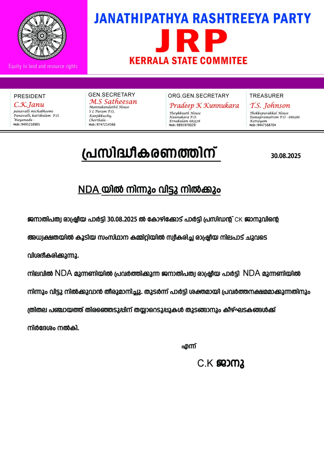 സി.കെ ജാനുവിന്റെ ജനാധിപത്യ രാഷ്ട്രീയ പാർട്ടി എൻഡിഎ വിട്ടു