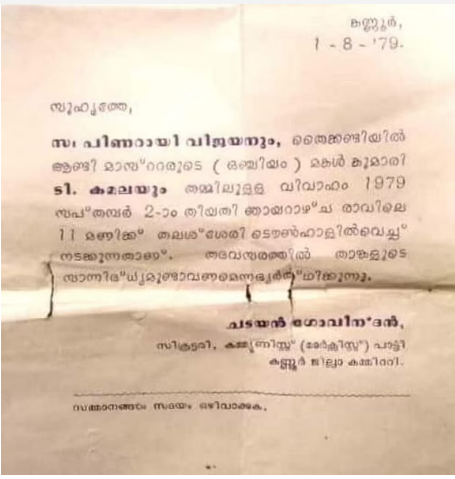 സി.പി.എം കണ്ണൂര് ജില്ലാ സെക്രട്ടറി ആയിരുന്ന ചടയന് ഗോവിന്ദന്റെ പേരിലുള്ളതാണ് ക്ഷണക്കത്ത്. 1979 സെപ്തംബര് രണ്ടിനാണ് വടകര ഒഞ്ചിയം തൈക്കണ്ടി സ്വദേശിനിയായ കമലയും പിണറായിയുമായുള്ള വിവാഹം. തലശ്ശേരിയിലെ സെന്റ്. ജോസഫ്സ് സൂകൂളിലെ അധ്യാപികയായിരുന്നു കമല. കൂത്തുപറമ്പ് എം.എല്.എയും സി.പി.എം കണ്ണൂര് ജില്ലാ സെക്രട്ടറിയേറ്റ് അംഗവും ആയിരുന്നു അന്ന് പിണറായി വിജയന്.