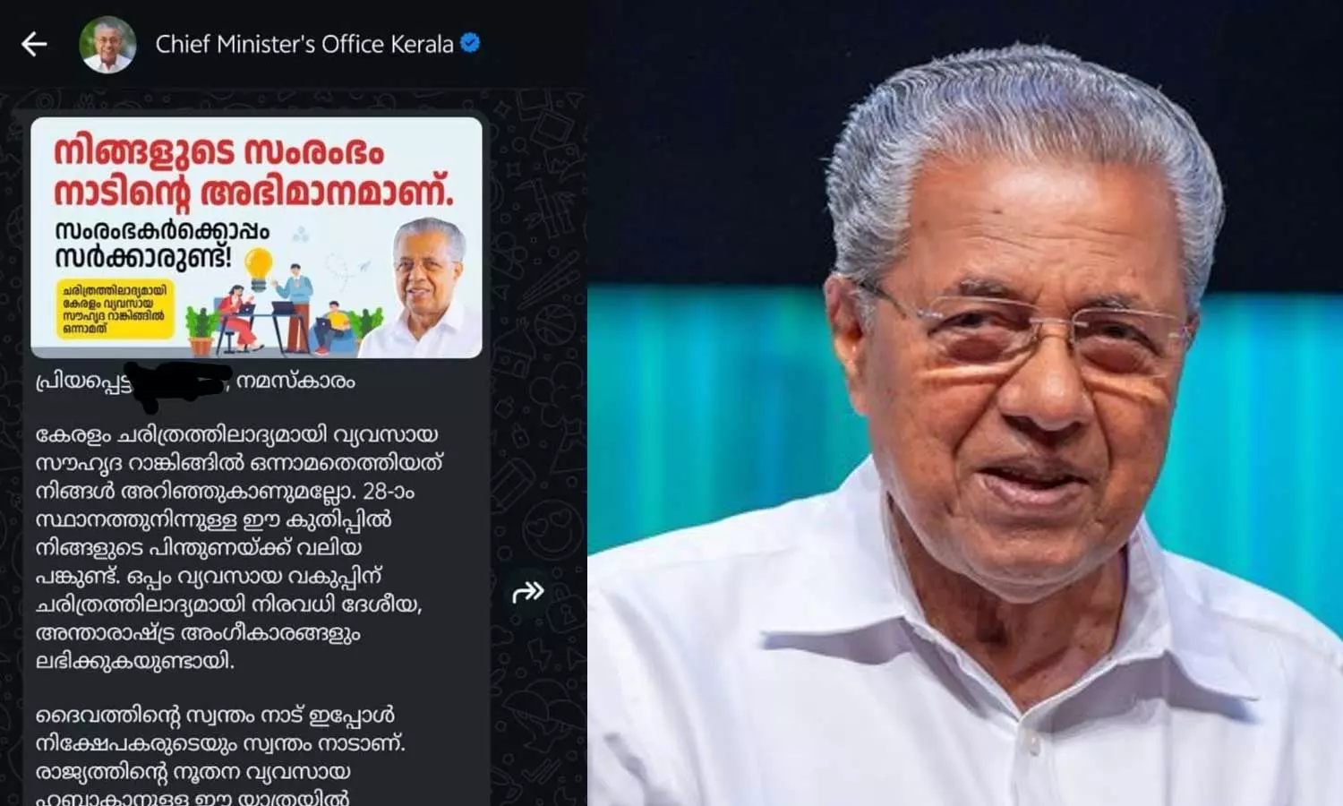 'നിങ്ങളുടെ സംരംഭം നാടിന്റെ അഭിമാനമാണ്, സംരംഭകർക്കൊപ്പം സർക്കാറുണ്ട്'; വ്യവസായികൾക്ക് മുഖ്യമന്ത്രിയുടെ വാട്ട്സാപ്പ് സന്ദേശം