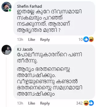 ‘ലോകത്തിലെ ഏറ്റവും മികച്ച പോലീസാണ് കേരള പോലീസ് എന്ന് ദേശാഭിമാനിയിൽ വായിച്ചിട്ട് അധികമായില്ല 🤭’ -എന്നായിരുന്നു മറ്റൊരാളുടെ കമന്റ്.