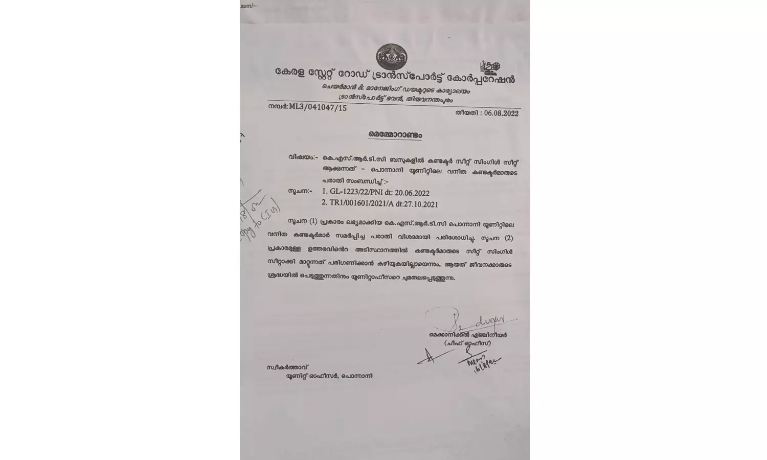 പൊന്നാനി യൂണിറ്റിലെ വനിതാ കണ്ടക്ടർമാർ നൽകിയ പരാതിയിലാണ് വിശദീകരണം