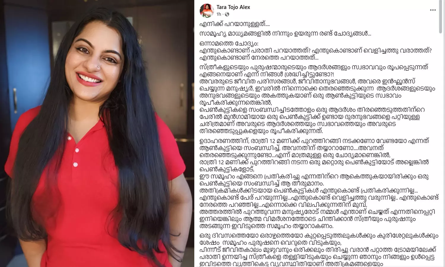 'ഒരു ദിവസത്തെയോ ഒരാഴ്ചത്തെയോ കുറ്റപ്പെടുത്തലുകൾക്കും കുരിശേറ്റലുകൾക്കും ശേഷം സമൂഹം പുരുഷനെ വെറുതെ വിടുകയും, പിന്നീട് ജീവിതകാലം മുഴുവനും ഒരിക്കലും തിരിച്ചു വരാൻ പറ്റാത്ത ട്രോമയിലേക്ക് പരാതി ഉന്നയിച്ച സ്ത്രീകളെ തള്ളിയിടുകയും ചെയ്യുന്ന ഞാനും നിങ്ങളും ഉൾപ്പെട്ട ഇവിടത്തെ വൃത്തികെട്ട വ്യവസ്ഥിതിയാണ് അതിക്രമങ്ങളെയും കടന്നുകയറ്റങ്ങളെയും കുറിച്ച് നിശബ്ദരായിരിക്കാൻ ഇവിടുത്തെ പെൺകുട്ടികളെ പ്രേരിപ്പിക്കുന്നത്. ഈ വ്യവസ്ഥിതി തിരുത്തിയതിന് ശേഷം മാത്രമേ എന്തുകൊണ്ട് നേരത്തെ പറഞ്ഞില്ല എന്തുകൊണ്ട് പേര് പറയുന്നില്ല എന്തുകൊണ്ട് വിളിച്ചു പറയുന്നില്ല എന്ന ബഹളം വയ്ക്കാൻ പാടുള്ളൂ.' താര എഴുതി.