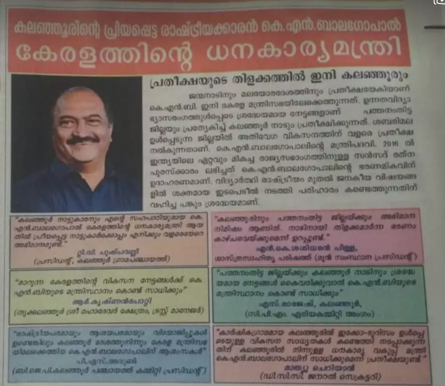 മന്ത്രി കെ എൻ ബാലഗോപാലിന് പത്ര പരസ്യത്തില് ആശംസ അറിയിച്ച് കോൺഗ്രസ് - ബിജെപി നേതാക്കൾ