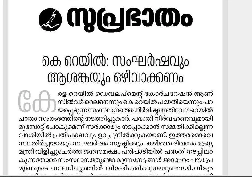സര്വെകല്ല് പിഴുതെറിയുന്ന കോണ്ഗ്രസ് സമരം സംസ്ഥാനത്തെ ക്രമസമാധാന നിലയെ ബാധിക്കുമെന്ന് സുപ്രഭാതം മുഖപ്രസംഗം.കോണ്ഗ്രസും പദ്ധതിയെ എതിര്ക്കുന്നവരും തെരുവിലിറങ്ങിയാല് വലിയ അക്രമത്തില് കലാശിക്കും, കെ റെയിലിനെക്കുറിച്ച് ധവള പത്രം പുറത്തിറക്കണം. സംഘർഷഭരിതമായ ഒരന്തരീക്ഷത്തിൽ ഒരു വികസന പ്രവർത്തനവും സുഗമമായി മുമ്പോട്ട് കൊണ്ടുപോകാനാവില്ലെന്നും നാടിന്റെ വികസനം ജനങ്ങൾക്ക് വേണ്ടിയാണെന്ന് ബോധ്യപ്പെടുത്തണമെന്നും മുഖപ്രസംഗത്തിൽ പറയുന്നു.