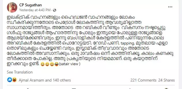 'ഇലക്ട്രിക് വാഹനങ്ങളും ഹൈഡ്രജൻ വാഹനങ്ങളും ലോകം സ്വീകരിക്കുന്നതോടെ പെട്രോൾ ലോകത്തിനു ആവശ്യമില്ലാത്ത സാധനമായിത്തീരും. അതോടെ അ റബികൾ വീണ്ടും വികസനം നഷ്ടപ്പെട്ടു ഗൾഫു രാജ്യങ്ങൾ ആഹാരത്തിനു പോലും ഇന്ത്യയെ പോലുള്ള രാജ്യങ്ങളെ ആശ്രയിക്കേണ്ടിവരും. ഇന്നു ബംഗാളികൾ കേരളത്തിൽ പണിയുന്നപോലെ അറബികൾ കേരളത്തിൽ പൊറോട്ടയടി, റോഡ് പണി, ടാപ്പിങ്, മുതലായ എല്ലാ തൊഴിലുകളും ചെയ്യേണ്ടി വരും. ഇസ്ലാമിക് തീവ്രവാദവും അതോടെ ലോകത്തിൽ അവസാനിക്കും. ഒരു 20വർഷം ഒന്ന് കാത്തിരിക്കൂ. കാലം കണക്കു തീർക്കാതെ പോകില്ല. അതു പ്രകൃതിയുടെ നിയമമാണ്. ഒരു കയറ്റത്തിന് ഇറക്കവും ഉണ്ട്.' - എന്നാണ് കുറിപ്പ്.