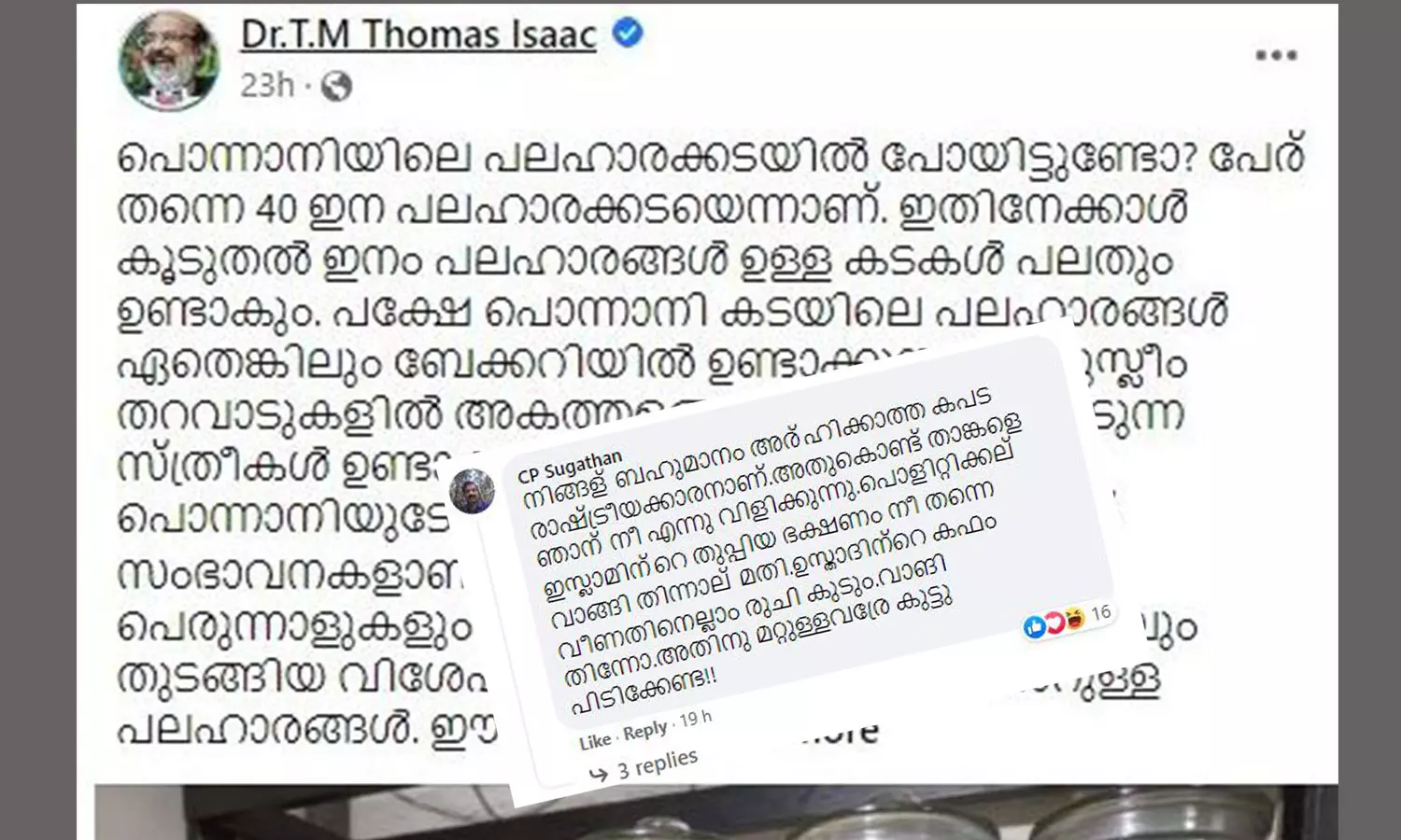 പൊന്നാനിയിലെ മുസ്ലിം തറവാടുകളിൽ സ്ത്രീകളുടെ നേതൃത്വത്തിലുണ്ടാക്കുന്ന 40ഓളം വരുന്ന പലഹാരക്കടികൾ വിൽക്കുന്ന കടയെക്കുറിച്ചായിരുന്നു തോമസ് ഐസക്കിന്റെ ഫേസ്ബുക്ക് പോസ്റ്റ്. വിവിധതരം അപ്പങ്ങൾ, പത്തിരികൾ, കേക്കുകൾ, മറ്റു വിഭവങ്ങളെല്ലാം വിവരിക്കുന്നുണ്ട് പോസ്റ്റിൽ. രാത്രി വൈകിയെത്തിയതിനാൽ ഷെൽഫ് കാലിയായിരുന്നുവെന്ന സങ്കടവും അദ്ദേഹം വെളിപ്പെടുത്തുന്നുണ്ട്. ഇതിനു താഴെയാണ് സുഗതന്റെ വിദ്വേഷ പരാമർശങ്ങൾ അടങ്ങിയ കമന്റ്.