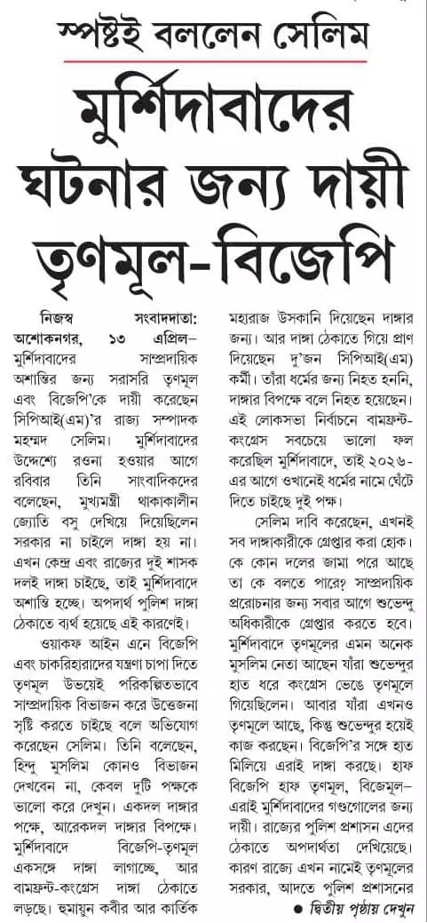 വെസ്റ്റ് ബംഗാളിൽ കൊല്ലപ്പെട്ട സഖാക്കളായ ഹർ ഗോബിന്ദ ദാസിനെയും ചന്ദൻദാസിനെയും വധിച്ചത് ബിജെപിയും തൃണമൂൽ കോൺഗ്രസുമെന്ന് വെസ്റ്റ് ബംഗാൾ സിപിഎം. ജമാഅത്തെ ഇസ്ലാമിയാണെന്ന് കേരളത്തിലെ സൈബർ സഖാക്കൾ. താഴെയുള്ള ഫോട്ടോയിലൊന്ന് മുർഷിദാബാദിലെ സംഘർഷത്തിനു പിന്നിൽ തൃണമൂലും ബിജെപിയുമെന്ന് ബംഗാളിലെ പാർട്ടി പത്രമായ ഗണശക്തിയിൽ വന്ന സി.പി.എം ബംഗാൾ ഘടകത്തിന്റെ പ്രസ്താവനയാണ്. ബിജെപിയെ കുറ്റപ്പെടുത്താൻ കേരളത്തിലെ സിപിഎം ഭയക്കുന്നുവെന്നർത്ഥം.