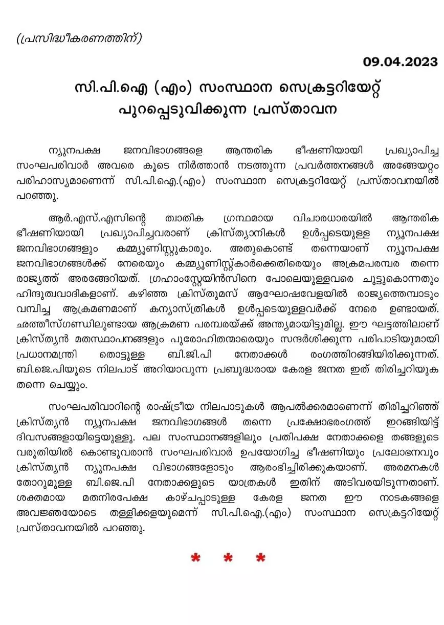 സംഘ്പരിവാറിന്റെ രാഷ്ട്രീയ നിലപാടുകൾ ആപത്ക്കരമാണെന്ന് തിരിച്ചറിഞ്ഞ് ക്രിസ്ത്യൻ ന്യൂനപക്ഷ ജനവിഭാഗങ്ങൾ തന്നെ പ്രക്ഷോഭരംഗത്ത് ഇറങ്ങിയിട്ട് ദിവസങ്ങളായിട്ടെയുള്ളൂ. പല സംസ്ഥാനങ്ങളിലും പ്രതിപക്ഷ നേതാക്കളെ തങ്ങളുടെ വരുതിയിൽ കൊണ്ടുവരാൻ സംഘപരിവാർ ഉപയോഗിച്ച ഭീഷണിയും പ്രലോഭനവും ക്രിസ്ത്യൻ ന്യൂനപക്ഷ വിഭാഗങ്ങളോടും ആരംഭിച്ചിരിക്കുകയാണ്. അരമനകൾ തോറുമുള്ള ബി.ജെ.പി നേതാക്കളുടെ യാത്രകൾ ഇതിന് അടിവരയിടുന്നതാണ്. ശക്തമായ മതനിരപേക്ഷ കാഴ്ചപ്പാടുള്ള കേരള ജനത ഈ നാടങ്ങളെ അവജ്ഞയോടെ തള്ളിക്കളയുമെന്നും സി.പി.എം വാർത്താക്കുറിപ്പിൽ പറയുന്നു.